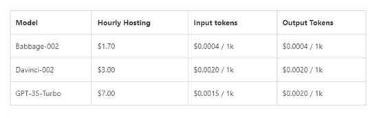 收费标准:Babbage-002 托管每小时 1.7 美元,Davinci-002 每小时 1.7 美元,GPT-35-Turbo,每小时 7 美元。