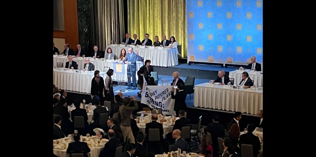 一羣高呼 “停止為化石燃料融資” 的環保主義者衝入鮑威爾發表演講的會場,高舉橫幅,鮑威爾的開場白被打斷,幾分鐘後抗議者被 “請出” 會場,鮑威爾重新開始講話。