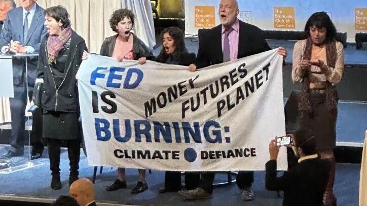 媒體的以下截圖可見,五名抗議者舉着寫有 “美聯儲在燃燒:貨幣、未來、地球” 的橫幅衝上講台。橫幅中註明,這些抗議來自名為 Climate Defiance 的環保組織。