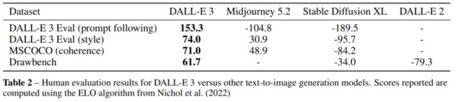 結果顯示,DALL-E 3 在所有三個方面,尤其是在提示跟隨方面,DALL-E 3 生成的圖像在大多數情況下都比所有競爭對手更受人類評分者的青睞。