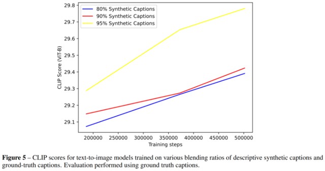 下圖 5 中的結果表明,合成描述混合比例越高,CLIP 分數往往越高,兩者呈正比關係。