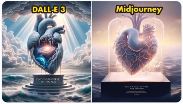 DALL・E 3 vs. Midjourney 文生圖效果。prompt:這幅插畫描繪了一顆由半透明玻璃製成的人心,矗立在驚濤駭浪中的基座上。一縷陽光穿透雲層,照亮了心臟,揭示了其中的小宇宙。地平線上鐫刻着一行醒目的大字「Find the universe within you」。