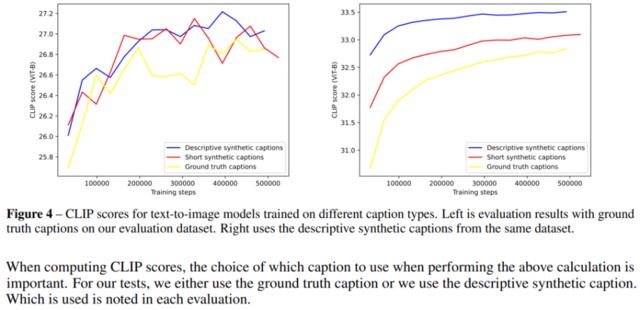 結果如下圖 4 所示,其中在合成描述上訓練的模型會得到比在真值描述上評估的基線模型好一些的 CLIP 分數性能,並且在描述性合成描述上評估時性能會明顯更好。這表明在訓練文本到圖像模型時使用合成描述沒有缺陷。