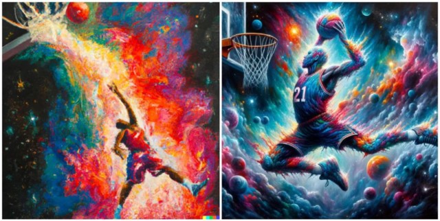 DALL・E 2 與 DALL・E 3 的生成效果對比。對於同樣的 prompt「一幅描繪籃球運動員扣籃的油畫,並伴以爆炸的星雲」,左圖 DALL・E 2 在細節、清晰度、明亮度等方面顯然遜於右圖 DALL・E 3。