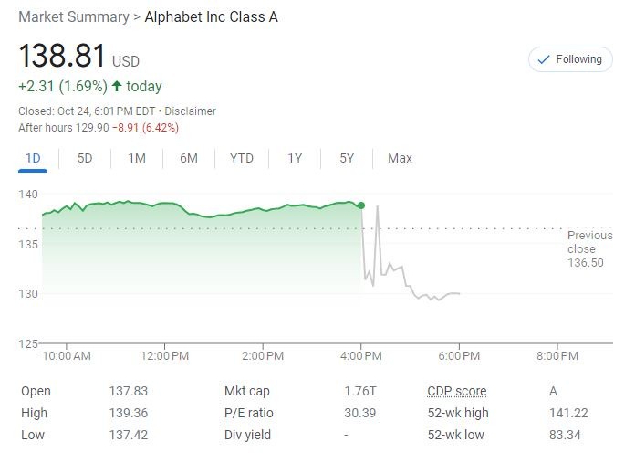 儘管三季報營收和盈利整體好於預期,谷歌雲營收遜於預期,股價盤後跌超 6%。谷歌 A 週二收漲 1.7%,接近抹去上週二以來跌幅。