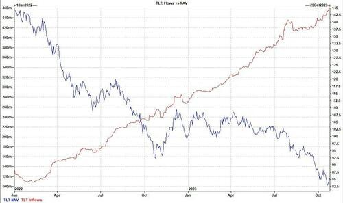 僅週二和週三,投資者就向 iShares 20+ Year Treasury Bond ETF 增資超過 20 億美元,使其今年迄今的總流入額達到 210 億美元。其基金份額接近 16 年來的最低點,價值從 2020 年的峯值已經腰斬逾半,目前投資者源源不斷湧入。