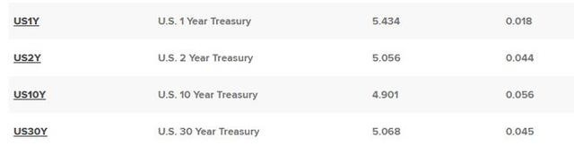 其他資產中,美債收益率集體小幅上行,但 10 年期基債收益率徘徊 4.90% 一線,一週前的週一曾一舉升破 5% 關口並創十六年最高。有分析稱,美債收益率未來 12 個月內或進入下行通道。