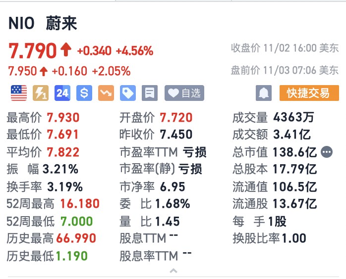 在裁員消息傳出後,蔚來美股盤前漲超 2%。