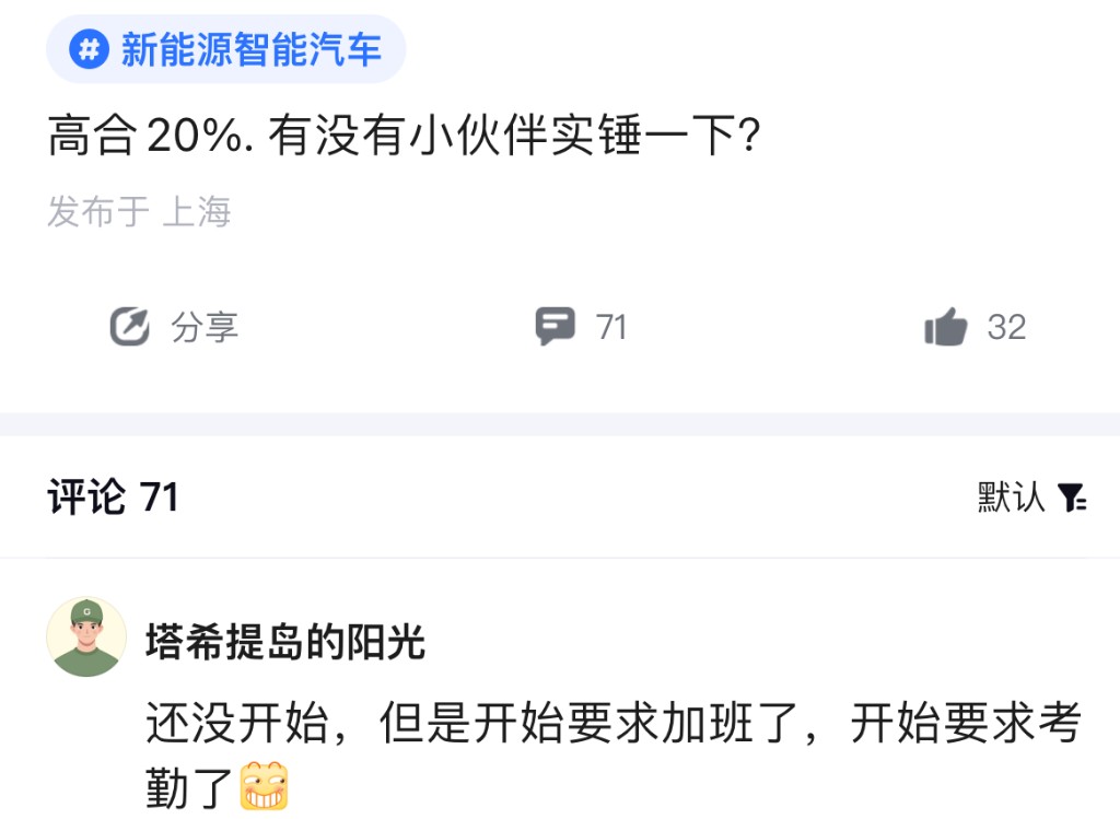 日前,在某職場社交平台上,有認證身份為高合汽車員工的網友爆料稱,高合汽車開啓了一輪大規模裁員。此次裁員比例高達 20%,個別部門裁員達到 50%。同時,有知情人士表示,高合汽車此次裁員每個部門都有指標,比例不一,“沒成果、低績效的項目組和人員是主要裁員對象”。