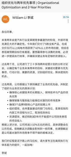 11 月 3 日下午,蔚來創始人、董事長、CEO 李斌發佈《組織優化與兩年優先事項》的內部全員信(以下簡稱 “全員信”),回應裁員傳聞。