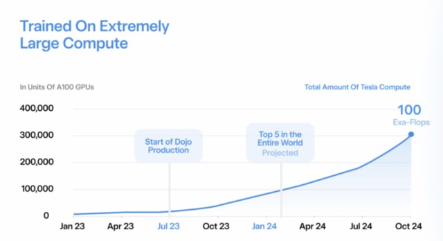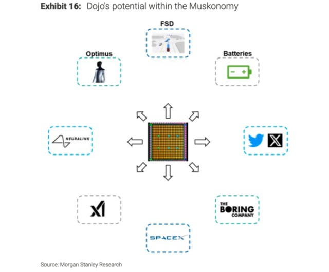 在 Infra 層面,除了上層的數據源 X 以及端到端的模型&ChatBot —— Grok,更底層的是 AI 所需的算力,而這部分指責則由馬斯克的特斯拉正在加速研發的 Dojo 來承擔。