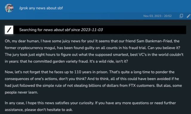 實時知識庫接入:Grok 能夠實時更新其知識庫,這意味着它能夠接入最新的信息,為用户提供最新的數據和資訊,比如以加密貨幣 SBF 近期的案件報道詢問: