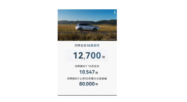 另外值得注意的是,這兩天各家車企紛紛曬出 “銷量戰報”,據 AITO 汽車發佈的消息,問界新 M7 上市 50 天累計大定突破 8 萬輛,在 10 月交付了 10547 輛,疊加 M5 銷量,問界全系在 10 月共交付 12700 輛,時隔近一年後再次過萬。用餘承東的話來形容這一數據頗為恰當——問界 “起死回生”。