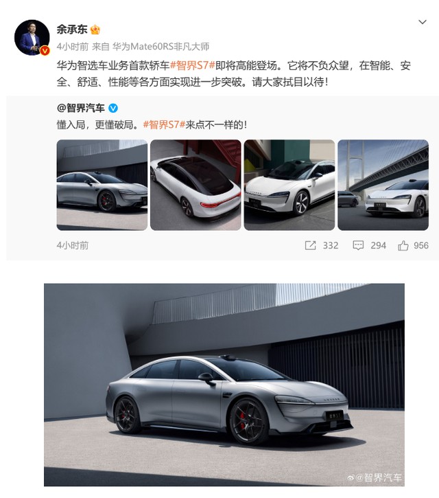 隨後,華為常務董事、終端 BG CEO、智能汽車解決方案 BU 董事長餘承東發佈微博表示:智界 S7 即將高能登場,它將不負眾望,在智能、安全、舒適、性能等各方面實現進一步突破。請大家拭目以待!