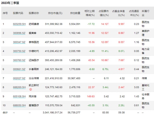 從重倉股來看,寧德時代佔基金淨值比,延續了 2 季報的下降勢頭。