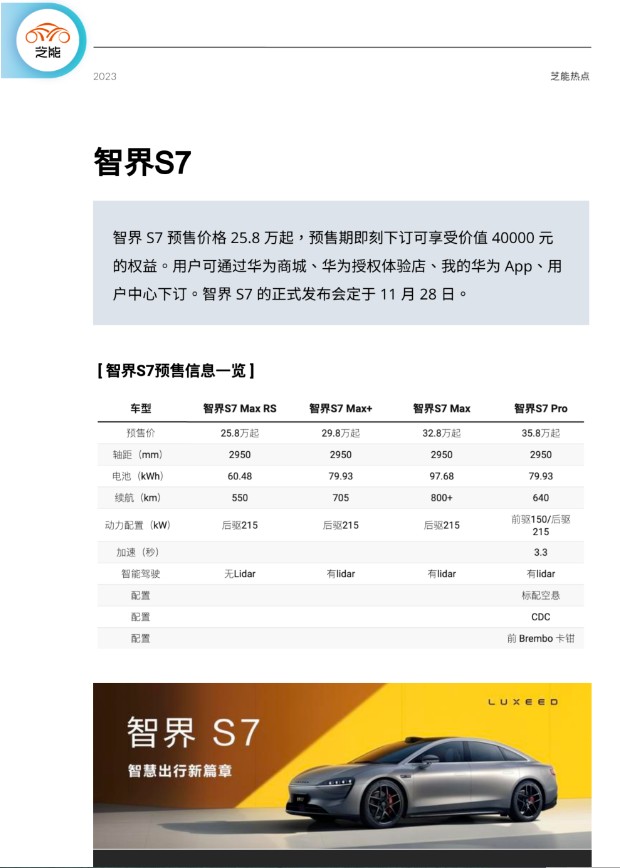 昨天晚上,華為與奇瑞汽車合作的智能新能源汽車品牌——智界,發佈了首款車型智界 S7,定位為 C 級轎車,搭載了華為的鴻蒙 HarmonyOS 4 系統、途靈智能底盤和 DriveONE 800V 高壓碳化硅黃金動力平台,預售價為 25.8 萬元起,將於 11 月 28 日正式上市。華為智選車模式下,首個品牌問界的車型問界 M5 和問界 M7 取得了成功,其中問界 M7 大定破 8.6 萬,問界 M9 盲訂量已經超過 2.5 萬。華為推出了第二個智能汽車品牌——智界(LUXEED),成為華為智選車 “全家桶” 的成員。