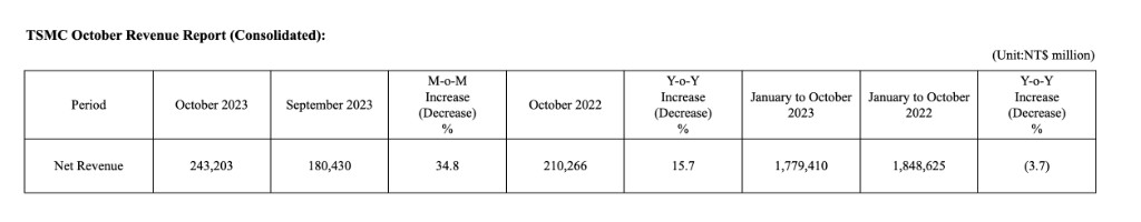 11 月 10 日周五,台积电公布 10 月营收报告。报告显示,10 月台积电合并营收为 2432.03 亿元新台币(约合 549.64 亿元人民币),环比增长 34.8%,较上年同期增长 15.7%,而这也为台积电自今年 2 月以来单月营收首次同比正增长。