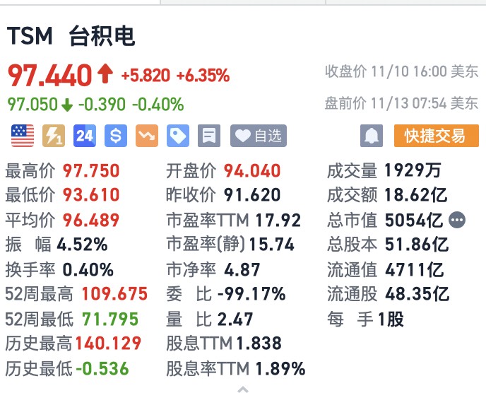 分析师认为这也可以看出全球芯片市场似乎正逐渐从低谷中复苏。受此消息提振,台积电美股上周五收涨 6.35%,创下 5 月份以来的最大单日涨幅,今日美股盘前台积电小幅下跌 0.4%。