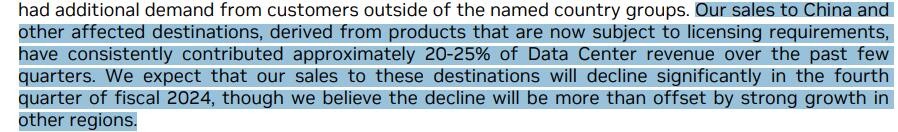 Kress 表示,英偉達相信,中國等部分地區的銷售下降將足以被四季度其他地區的強勁增長所抵消。不過,對於中國等受出口許可證要求影響的地區,Kress 指出,最近幾個季度,這些地區持續貢獻了 20% 到 25% 的數據中心業務收入。