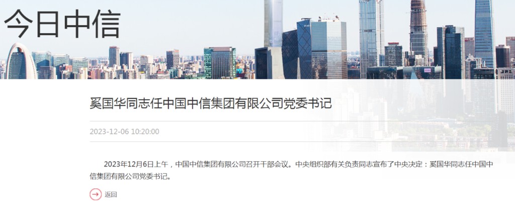 中信集團 12 月 6 日公告,當天上午,中國中信集團有限公司召開幹部會議。中央組織部有關負責人宣佈了中央決定:奚國華任中國中信集團有限公司黨委書記。