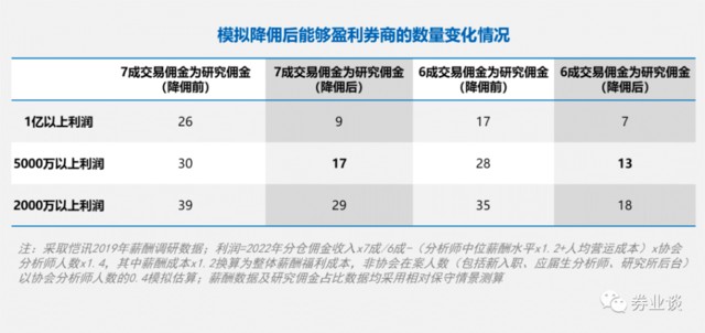 交易佣金降低 40%,直接等同於研究佣金收入的降幅,很多研究所面臨無法覆蓋基本成本的局面。如果以 2019 年的分析師薪酬中位水平代表此次降薪潮後的薪酬水平,測算出僅約 13-17 家研究所可實現 5000w 以上的利潤,較之前家數會降低 40-50%。