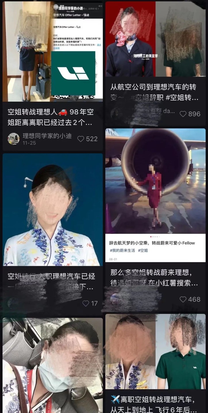 從發文標題來看,幾乎都是 “放棄空姐理想去賣車,空姐轉戰理想人,從航空公司到理想汽車的轉變”。有博主稱,結束了多年的飛行生涯,不用再被早班鬧鐘驚醒,不用再被黑名單煩惱,不用再因為大練兵焦慮……最終加入了有挑戰的理想汽車團隊。
