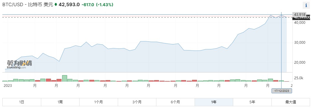 如果要談到今年最值得關注的資產,那毫無疑問是比特幣。在 2022 年暴跌 65% 之後,比特幣今年的漲幅領跑市場。其價格從年初的約 1.9 萬美元一路飆升到年底的 4.4 萬美元,漲幅超過了 136%。