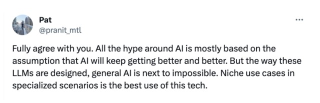 有網友認為:“圍繞人工智能的所有炒作大多是基於這樣一個假設:人工智能將會越來越好。但按照這些大型語言模型的設計方式,實現通用人工智能幾乎是不可能的。在特定場景下的小眾用例是這項技術的最佳使用方式。”
