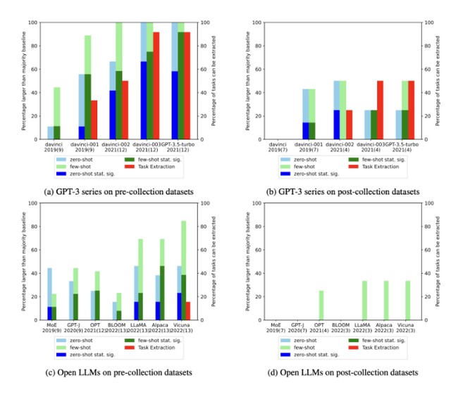 - 在實驗中,對於沒有展示出污染可能性的分類任務,大模型在零樣本和少樣本設置裏很少顯示出相對多數基線在統計學意義上的顯著性改進。