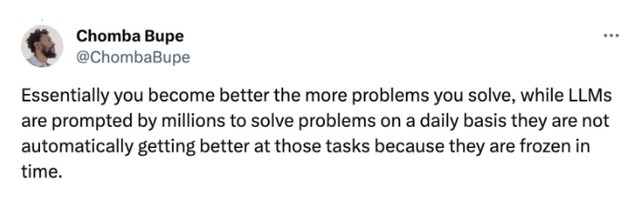 “從本質上講,你解決的問題越多,就會變得越好,而大模型雖然每天被數以百萬計的問題所觸發,它們並不會自動地在這些任務上變得更加出色,因為它們的學習能力被凍結在了某一時刻。”