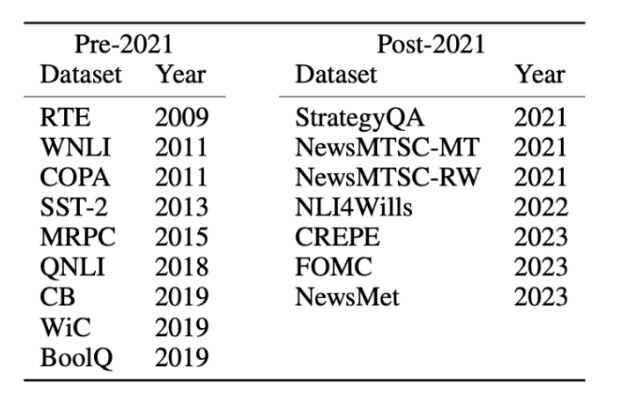 在數據集上則劃分為兩類:2021 年之前和 2021 年之後發佈的數據集。以此來對比新老數據集之間的零樣本或少樣本任務性能差異。