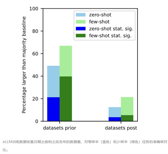 eLLM 訓練數據收集日期之前和之後發佈的數據集,對零樣本(藍色)和少樣本(綠色)任務的準確率對比。