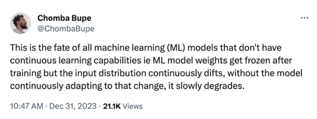 對於沒有持續學習能力的機器學習模型來説,其權重在訓練後被凍結,但輸入分佈卻不斷漂移。近兩億用户五花八門的新問題日夜不間斷,如果模型不能持續適應這種變化,其性能就會逐步退化。