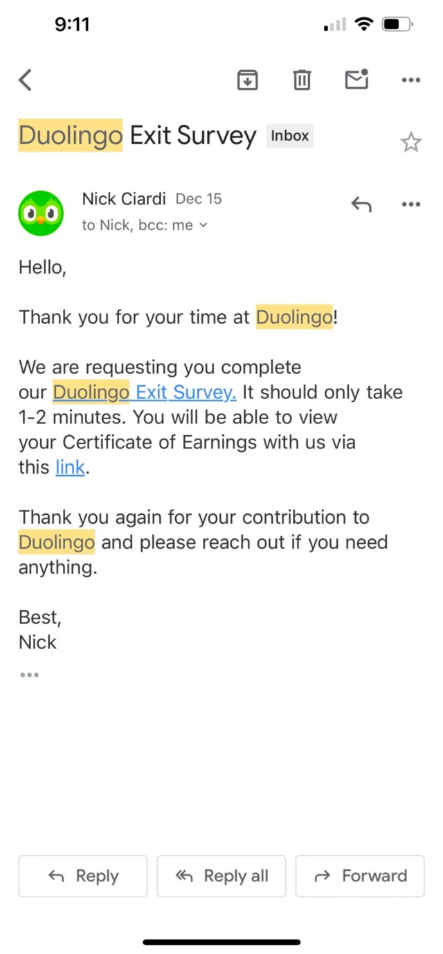 一位在多鄰國工作了 5 年的員工在網上分享了自己的經歷:“我們的團隊有四名核心成員,其中兩人被解僱了,剩下的兩個人只負責審查人工智能內容,以確保它是可以接受的。” 圖片顯示,他是在去年 12 月中旬通知被解僱的。需要注意,這次多鄰國辭退的是外部合同工,而不是內部正式員工。