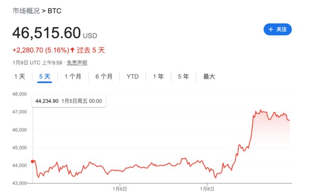 截至北京時間 1 月 9 日 18 點,比特幣小幅下跌至 46515 美元。今年以來,比特幣已漲約 10%,與同期美國股市和黃金的下跌形成鮮明對比。