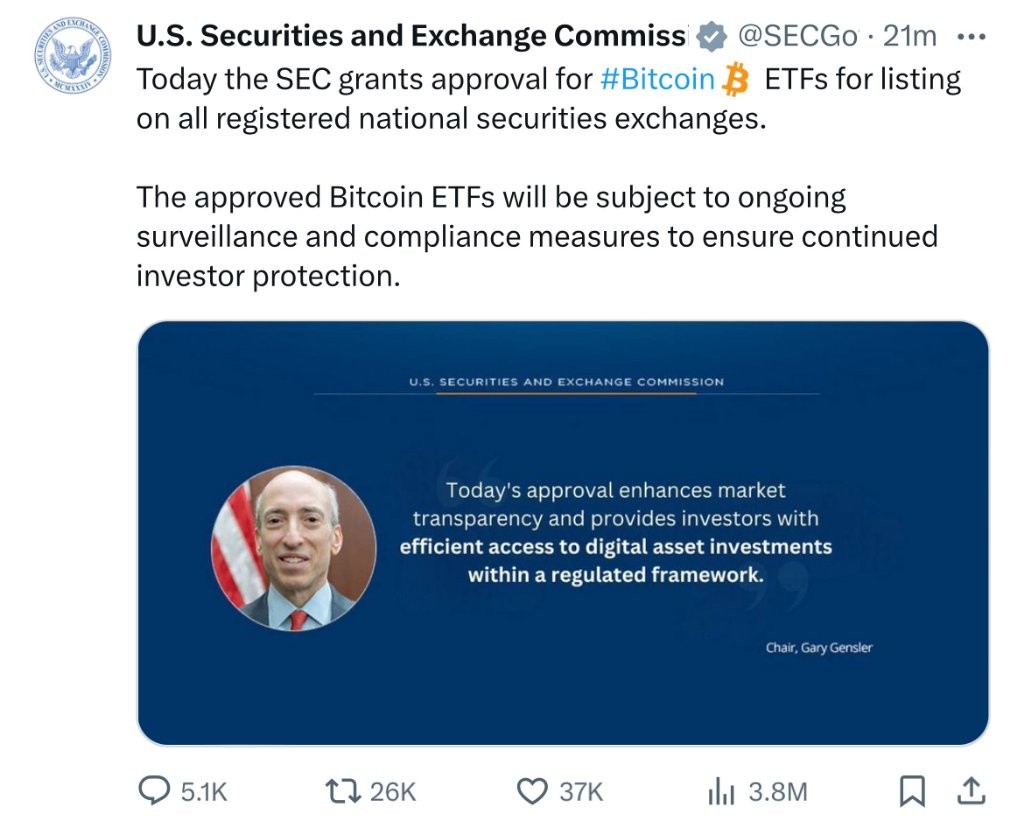 美東時間 1 月 9 日週二美股尾盤,美國證監會(SEC)在社交媒體 X 的官方賬號公佈,批准了所有比特幣現貨 ETF 在美國全國性交易所上市的申請,還聲稱,獲批的 ETF 將持續受到監督,要保證它們的合規措施一直保護投資者。