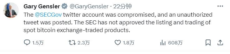 SEC 主席 Gary Gensler 此後通過他的個人 X 賬號發帖稱,SEC 的官方 X 賬號遭到黑客攻擊,發了一個未經授權的帖子,SEC 並未批准現貨 ETF 上市和交易。