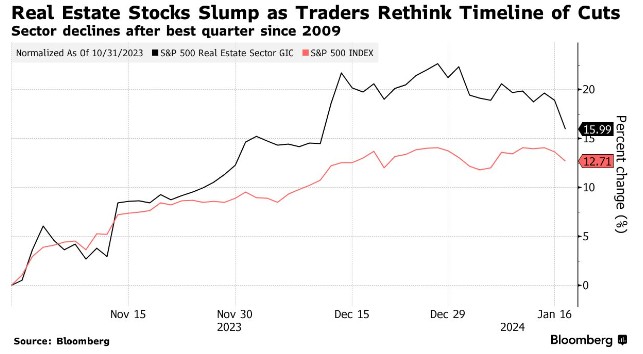 房地產類股週三成為拖累標準普爾 500 指數的最大板塊,因交易員撤回了對美聯儲降息的押注。房地產市場勢必會受到衝擊,特別是辦公樓 REITs。房地產類股在 2023 年的大部分時間裏難以恢復穩定,投資者正在拋售股票。房地產投資信託基金 (REIT) 指數正走向去年 11 月以來最差的一週。