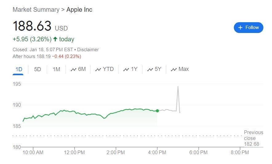 美銀報告公佈後,週四當天,蘋果股價高開高走,午盤曾漲至 189 美元上方,日內漲超 3.5%,刷新 2023 年 12 月 29 日以來盤中高位,最終收漲約 3.3%,創 12 月 29 日以來收盤新高,抹平進入進入 2024 年以來所有跌幅,扭轉連跌兩日的勢頭。