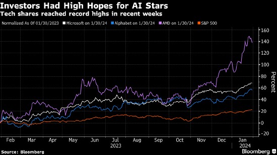 三家科技巨頭公佈 2023 年最後三個月的業績和當季指引後,股價紛紛在週二盤後下跌。他們苦苦強調人工智能取得的進展,AMD 預計新推出的 AI 處理器銷售額將高於預期,微軟則強調用户對其 AI 助手的喜愛,谷歌稱 AI 技術正在改善搜索和雲計算服務。
