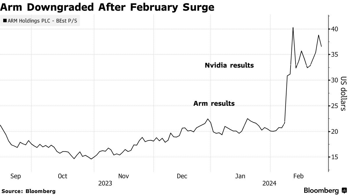 智通財經 APP 獲悉,2024 年迄今為止,英國芯片設計公司 Arm(ARM.US) 的股價上漲了超 83%,其中 2 月以來的股價漲幅超 95%。Arm 股價的反彈導致其預期市盈率升至 36.5 倍,遠高於納斯達克 100 指數的任何成分股,且相比之下,其競爭對手英偉達 (NVDA.US) 的預期市盈率不到 18 倍。Arm 的估值似乎已經過高,就連最早一批看漲該股的人士也認為該股股價走得太遠了。