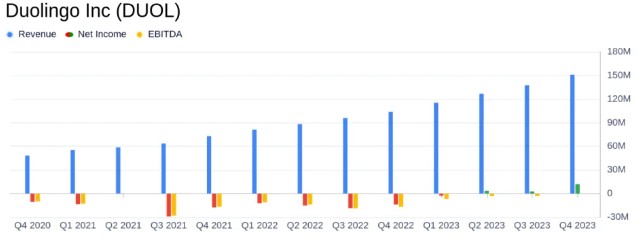 2 月 28 日,“美國新東方” Duolingo 發佈了截至 2023 年 12 月 31 日的第四季度財報。財報顯示,Duolingo2023 年 Q4 營收同比增長 45% 至 1.51 億美元,高於分析師預期 1.48 億美元。