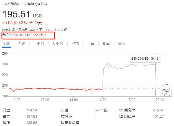 財報發佈後,週三美股盤後,Duolingo 股價漲超 20%。同時,股票在過去一年漲幅達到 115%,遠超同期標普 500 指數的 28%。