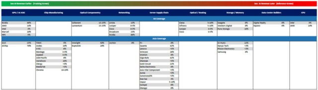 總之現在市場對 AI 的追逐,或者説尋找 “AI 新標的” 的熱情極其高漲。MS 搞了個 AI 股票座標系,橫軸 AI 收入佔比%,縱軸是 25 年 PE multiple。靜態去看的話,當然是越處於東南方向的越好。動態去看的話,大家都會往右邊走,誰能保持在趨勢線下方就是價格更划算。其實這種座標系,潛台詞就是 AI 佔比越高市場給與更多追逐從而會帶來更高估值溢價。那處於趨勢線下方的且偏離較遠的,都是 “潛力股”。