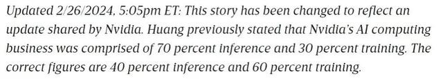 上週末 The wire 對 Jensen 的採訪廣泛傳播,但其中一個細節被修改了(來自讀者 Dai 的提醒),很微妙。原文中 Jensen 表示 “如果我猜的話,Nvidia 今天的業務可能是 70% 的推理,30% 的訓練。” 之後似乎是被公關修改了: