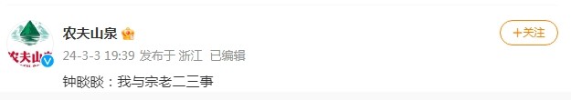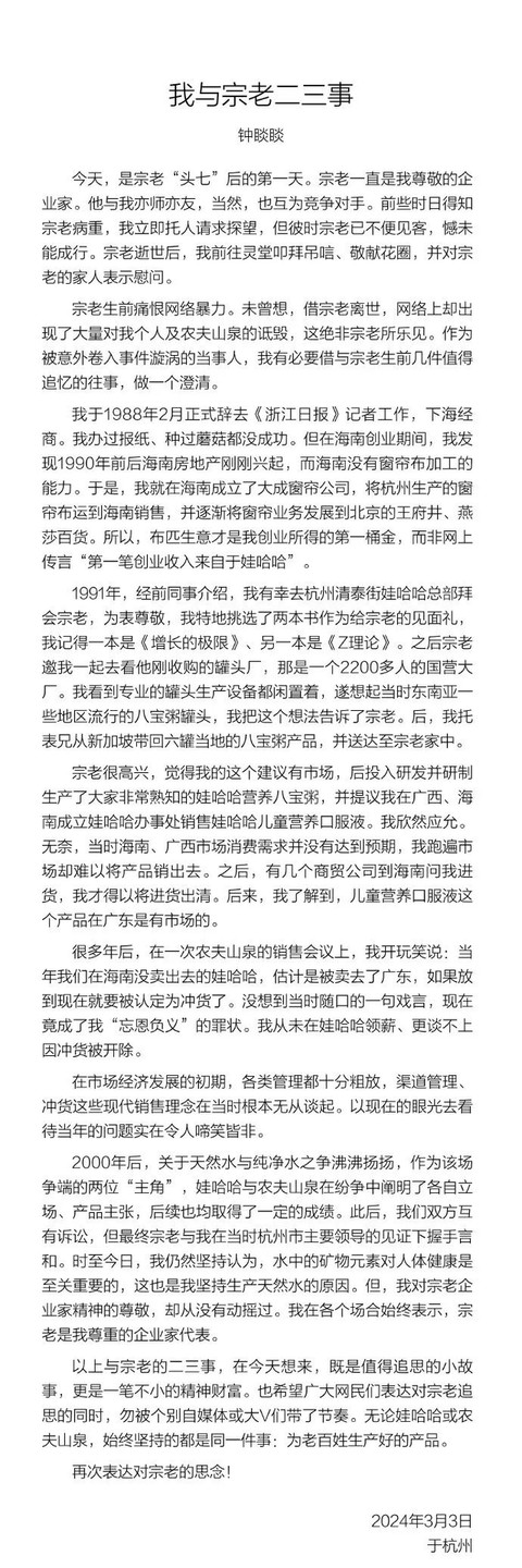 3 月 3 日,“農夫山泉” 官方微博發佈了《鍾睒睒:我與宗老二三事》。農夫山泉創始人、董事長、總經理鍾睒睒稱,借宗老離世,網絡上卻出現了大量對我個人及農夫山泉的詆譭。作為被意外捲入事件漩渦的當事人,他有必要借與宗老生前幾件值得追憶的往事,做一個澄清。