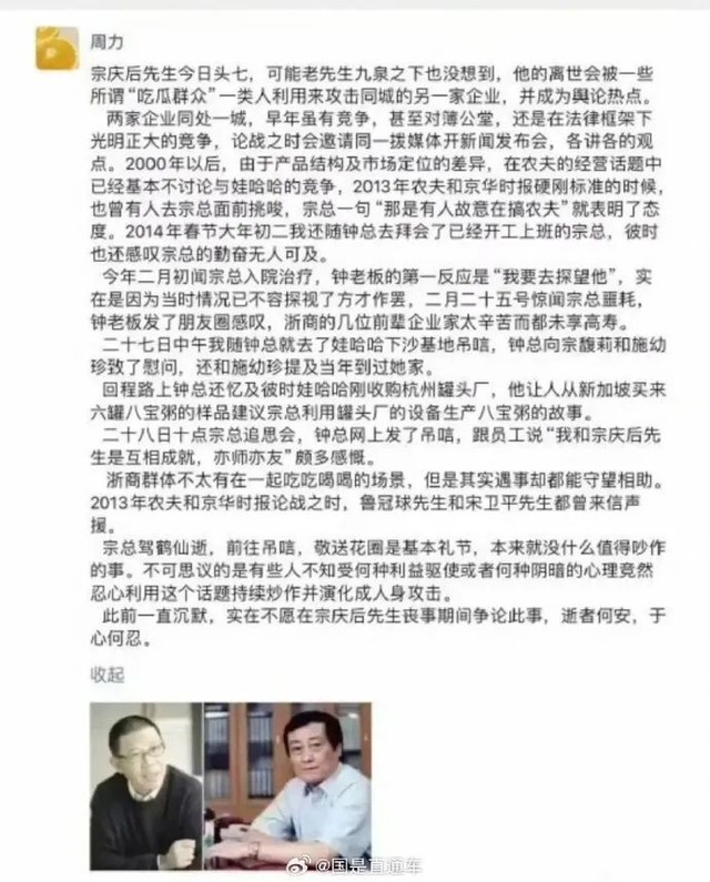 值得注意的是,據中新社國是直通車報道,3 月 3 日,農夫山泉副總周力朋友圈發文,回應 “捧 ‘娃哈哈’ 踩 ‘農夫山泉’ 風波”。周力表示,宗慶後先生今日頭七,可能老先生九泉之下也沒想到,他的離世會被一些所謂 “吃瓜羣眾” 一類人利用來攻擊同城的另一家企業,併成為輿論熱點。兩家企業同處一城,早年雖有競爭,甚至對薄公堂,還是在法律框架下光明正大的競爭。