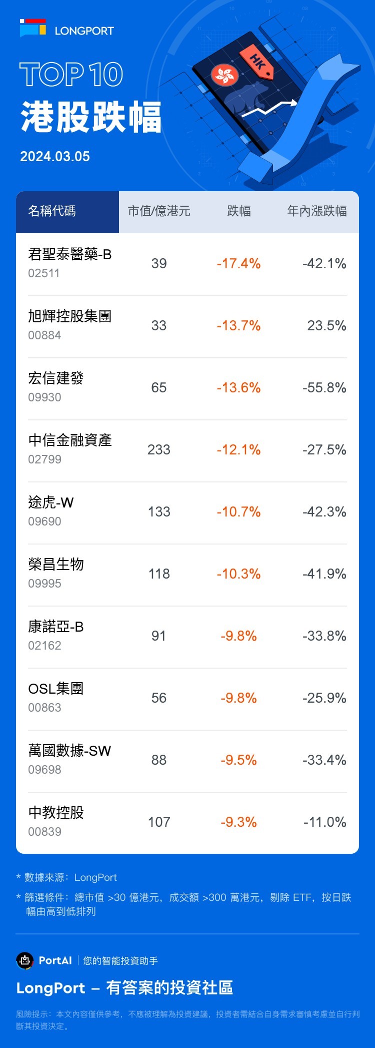 君聖泰醫藥-B(02511) 跌 17.38%,成交额 658.3 万港元,年内累计跌 42.1%。 旭輝控股集團 (00884) 跌 13.7%,成交额 7935.4 万港元,年内累计涨 23.5%。 宏信建發 (09930) 跌 13.62%,成交额 411.9 万港元,年内累计跌 55.8%。