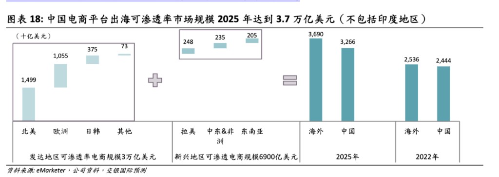 在海外市場中,新興地區如拉美、中東及東南亞等地線下商業佈局及物流體系搭建相對落後,是中國電商出海企業重點佈局地區,估算合計可滲透市場約 6900 億美元;發達地區雖然基礎設施完善,但市場空間大,合計可達 3 萬億美元規模,也是中國電商出海的目標地區。