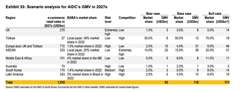 滙豐預計,阿里海外電商業務已逐漸發展成熟,其在歐盟 (包括主導市場土耳其)、東盟、韓國和拉丁美洲的龐大用户基礎,到 2027 年阿里海外電商 GMV 可以達到 1180 億美元,較 2022 年的 530 億美元翻番。